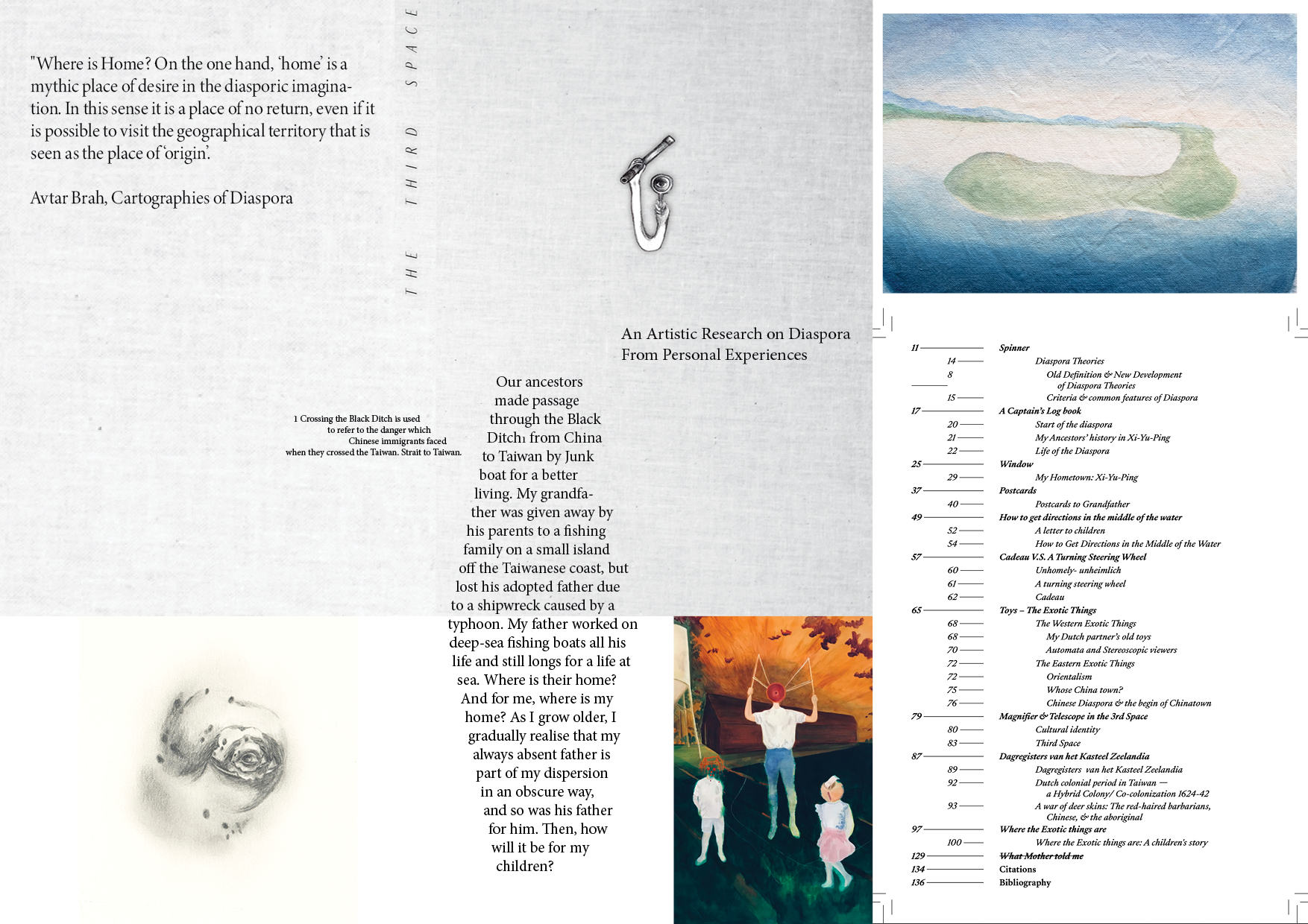 Third Space is the concept developed by Homi Bhabha to describe the hybrid cultural identity which emerges from the interweaving elements of different cultures. Bhabha posits hybridity as a liminal or in-between space, where the ‘cutting edge of translation and negotiations’ occurs (Bhabha 1996). During the process of this artistic research, I realised that all the segments in my works are a journey in the third-space, where my native culture and memories meet with my experience of Western culture. They collide and merge with each other, while I examine with a magnifying glass the Western culture with one hand and examine my past with a monocular with my other hand. I navigate in this space to find answers to questions of who am I and where is home to which I could return?